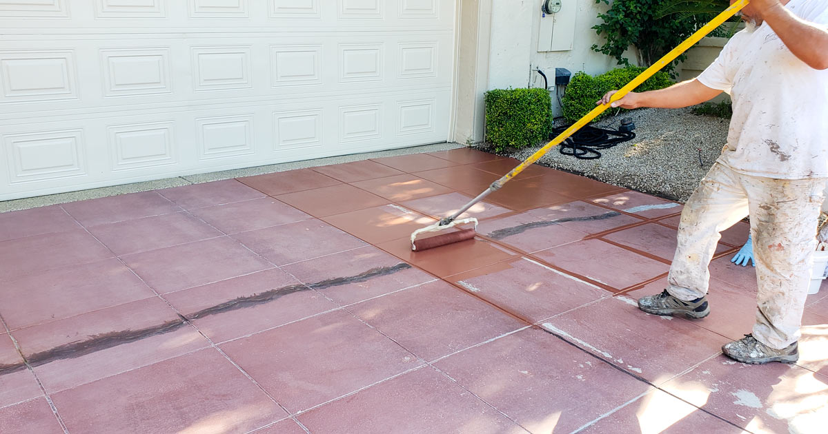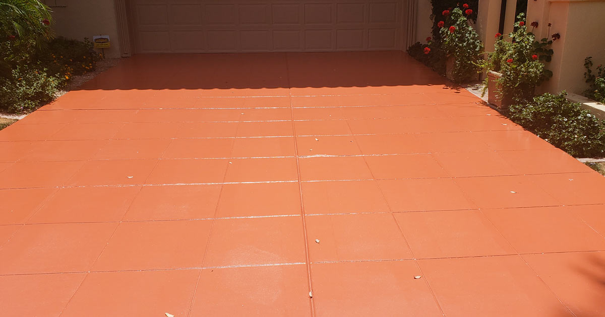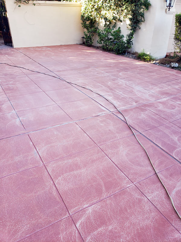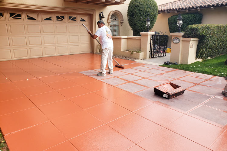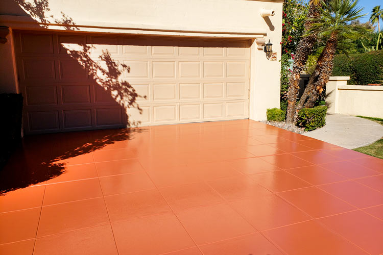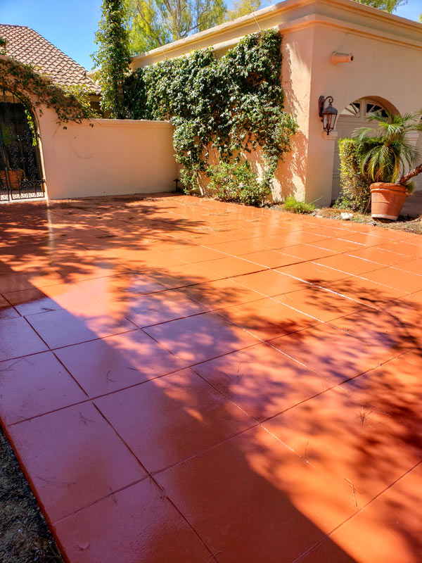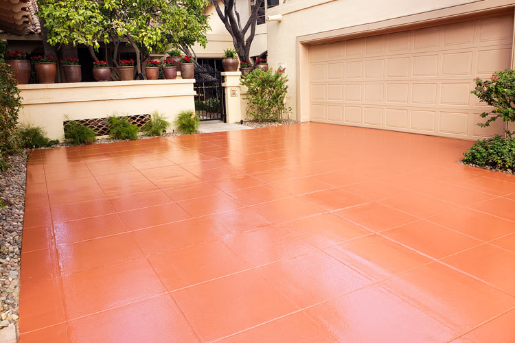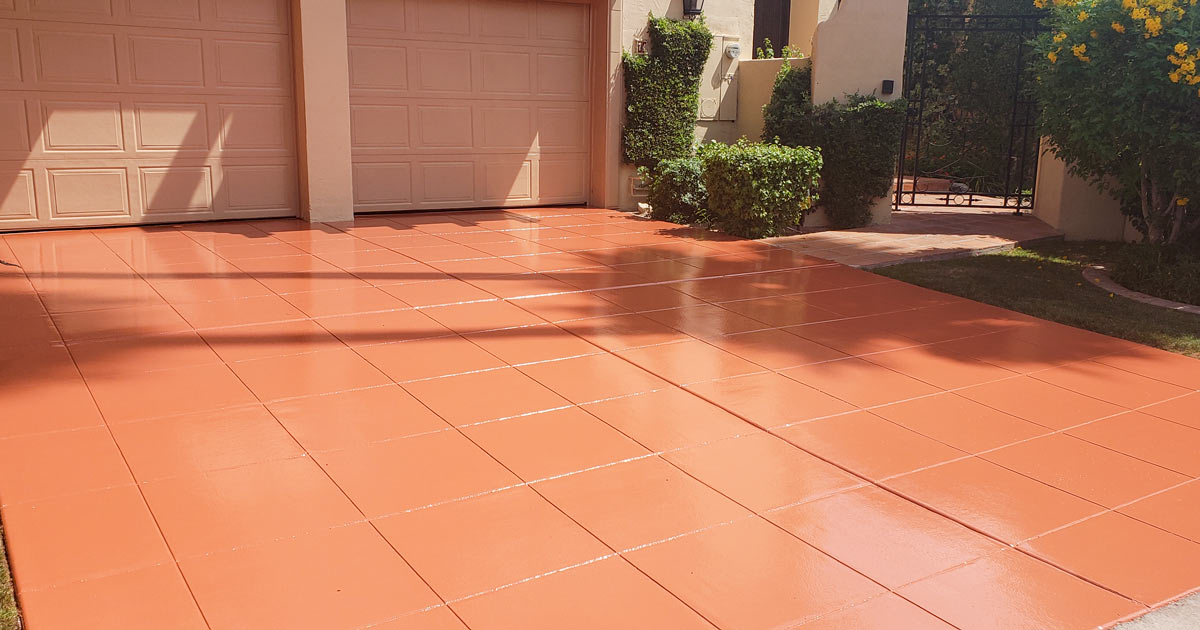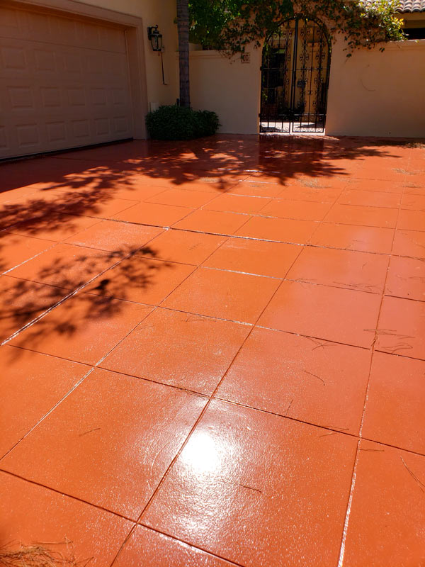Scottsdale, AZ — Local coatings contractor recently refinished multiple driveways in the Colonia Encantada subdivision. After more than 40 years since being built this subdivision is starting to show its age. The planned community once featured vibrant stained decorative concrete driveways. Unfortunately, after more than 40 years of brutal Arizona sun, most of the colored concrete surfaces have faded. This is where our coatings contractor came into the picture. They worked with the Colonia Encantada homeowners association (HOA) to approve a custom color concrete coating for use on all the concrete driveways within the subdivision. This ensured the HOA was happy with the color and the homeowners could once again enjoy the vibrant colonial styled colors of this planned community.
